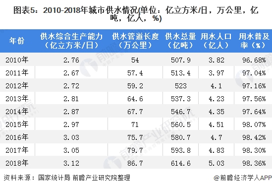 為滿足我改過城市自來水用戶不斷增長的用水需求,近十年來我國城市供水綜合生產(chǎn)能力穩(wěn)步增長。根據(jù)國家統(tǒng)計局數(shù)據(jù),截至2018年底,城市供水綜合生產(chǎn)能力達到3.12億立方米/日,其中生活用水328.8億立方米,用水人口5.03億人,人均日生活用水量179.7升,用水普及率98.36%。