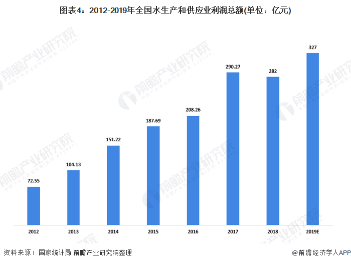 根據(jù)國家統(tǒng)計局數(shù)據(jù)顯示,2012-2018年,我國水生產(chǎn)和供應(yīng)業(yè)規(guī)模以上工業(yè)企業(yè)的主營業(yè)務(wù)收入和利潤總額逐年穩(wěn)步增長,復(fù)合增長率分別為12.52%和25.44%。2018年我國規(guī)模以上供水企業(yè)的數(shù)量達1934家,主營業(yè)務(wù)收入達到2600億元,主營業(yè)務(wù)成本超過1900億元,利潤總額在280億元左右。