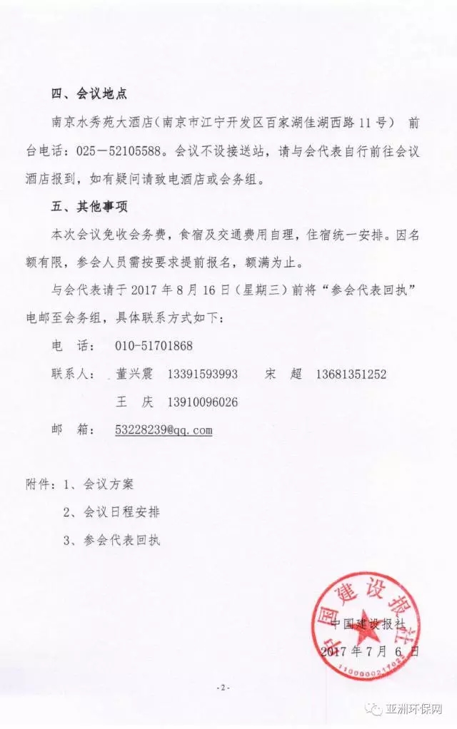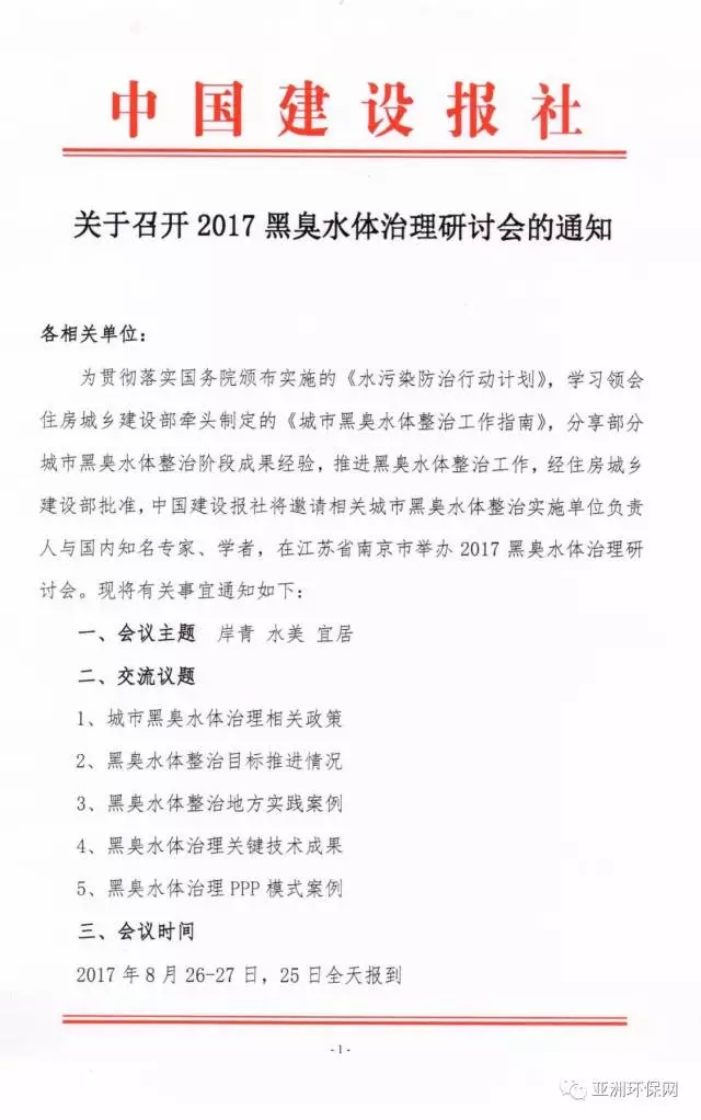 為貫徹落實國務(wù)院頒布實施的《水污染防治行動計劃》,學(xué)習(xí)領(lǐng)會住房城鄉(xiāng)建設(shè)部與環(huán)境保護部共同制定的《城市黑臭水體整治工作指南》,分享部分地區(qū)城市黑臭水體整治階段成果經(jīng)驗,推進黑臭水體整治工作,為此,經(jīng)住房城鄉(xiāng)建設(shè)部批準,中國建設(shè)報社主辦,邀請相關(guān)城市黑臭水體整治實施單位負責(zé)人與國內(nèi)知名專家、學(xué)者,在江蘇省南京市舉辦2017黑臭水體治理研討會?,F(xiàn)將有關(guān)事宜函告如下:
