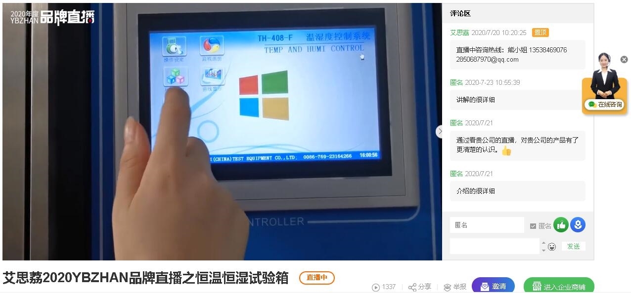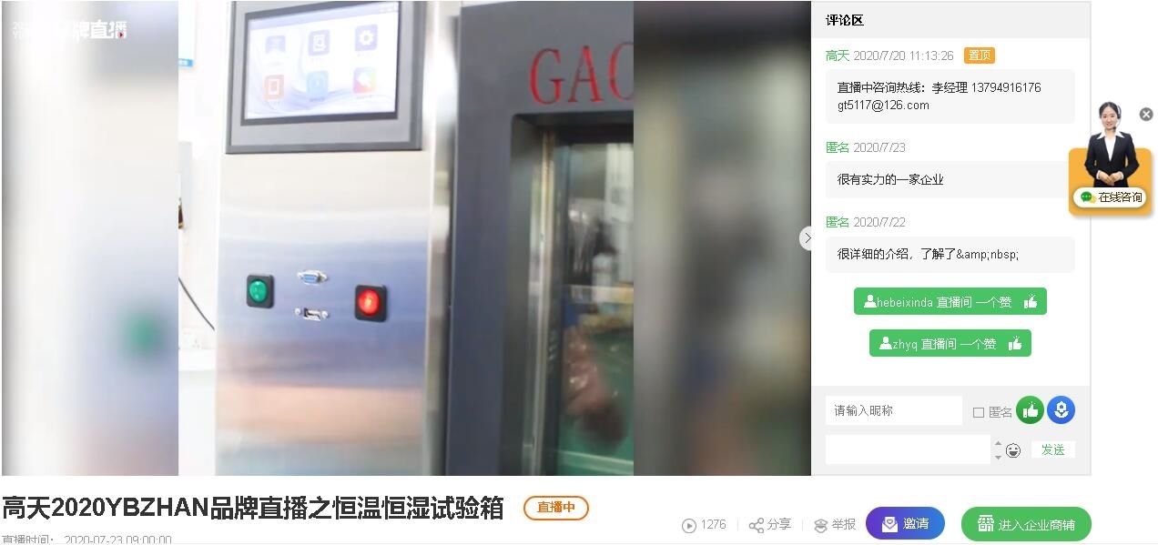 高天(←點(diǎn)擊進(jìn)入)直播間為大家?guī)砹斯局鳡I產(chǎn)品恒溫恒濕試驗(yàn)箱和冷熱沖擊試驗(yàn)箱的介紹。