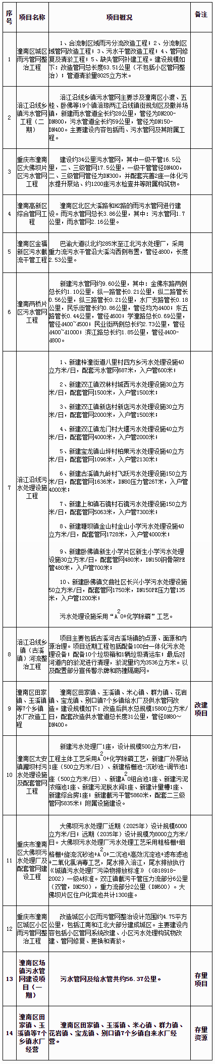 潼南區(qū)涪江流域水環(huán)境綜合治理PPP項(xiàng)目(一期)包括14個子項(xiàng)目,其中12個新改建子項(xiàng)工程和2個存量子項(xiàng)目;新改建子項(xiàng)目主要包括管網(wǎng)改造工程7個、污水處理設(shè)施工程3個、鄉(xiāng)鎮(zhèn)自來水廠改造工程1個、河流整治工程1個;存量子項(xiàng)目為7個鄉(xiāng)鎮(zhèn)自來水廠經(jīng)營和潼南區(qū)場鎮(zhèn)污水管網(wǎng)建設(shè)項(xiàng)目(一期)。子項(xiàng)目概況見表1。