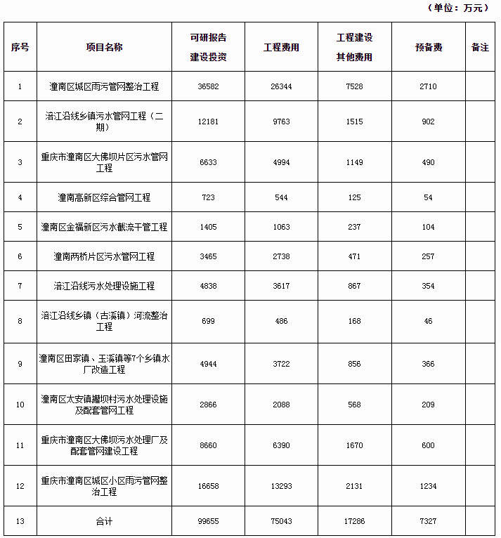 根據(jù)各子項(xiàng)目可行性研究報告批復(fù)文件和鄉(xiāng)鎮(zhèn)自來水廠經(jīng)營權(quán)評估報告、潼南區(qū)場鎮(zhèn)污水管網(wǎng)建設(shè)項(xiàng)目(一期)評估報告,本PPP項(xiàng)目建設(shè)投資(靜態(tài)投資)為116557萬元(其中:工程費(fèi)用75043萬元,工程建設(shè)其他費(fèi)17286萬元,預(yù)備費(fèi)7327萬元,7個鄉(xiāng)鎮(zhèn)自來水廠經(jīng)營權(quán)估值現(xiàn)值10365萬元,存量管網(wǎng)項(xiàng)目評估值6537萬元)。各工程項(xiàng)目投資估算統(tǒng)計(jì)如下表所述。