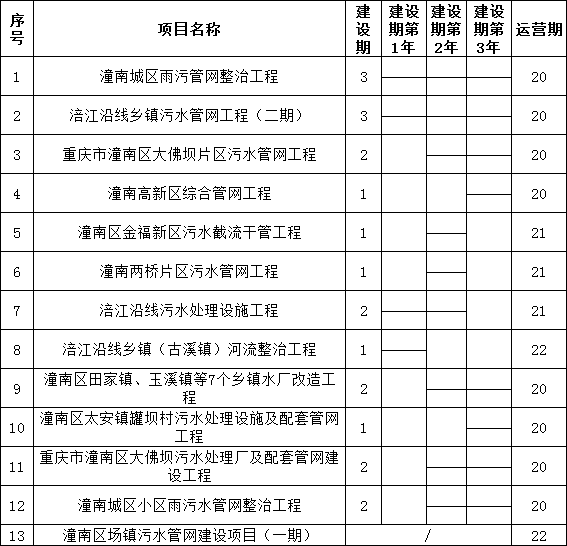 根據(jù)各子項(xiàng)目可研報告的實(shí)施進(jìn)度,確定本項(xiàng)目整體建設(shè)期為3年(各子項(xiàng)起始/結(jié)束時間不同,各子項(xiàng)目建設(shè)期為1-3年不等)。各子項(xiàng)目分別以各項(xiàng)目開工之日起計(jì)算建設(shè)期,由項(xiàng)目公司根據(jù)項(xiàng)目性質(zhì)及政府要求安排各子項(xiàng)目的建設(shè)進(jìn)度計(jì)劃。各子項(xiàng)目自試運(yùn)行合格或完工驗(yàn)收合格次日起即進(jìn)入運(yùn)營期,其中自來水廠項(xiàng)目、污水處理項(xiàng)目試運(yùn)行合格次日進(jìn)入運(yùn)營期,其它項(xiàng)目完工驗(yàn)收合格次日進(jìn)入運(yùn)營期;存量項(xiàng)目潼南區(qū)場鎮(zhèn)污水管網(wǎng)建設(shè)項(xiàng)目(一期)移交給項(xiàng)目公司后進(jìn)入運(yùn)營期。