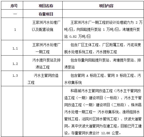 存量項(xiàng)目為王家洲污水處理廠以及配套設(shè)施。新建項(xiàng)目的建設(shè)內(nèi)容包括王家洲污水處理廠擴(kuò)建、泵站擴(kuò)建、管網(wǎng)建設(shè)與雨污分流改造工程、水環(huán)境智慧管控平臺(tái)建設(shè)工程。