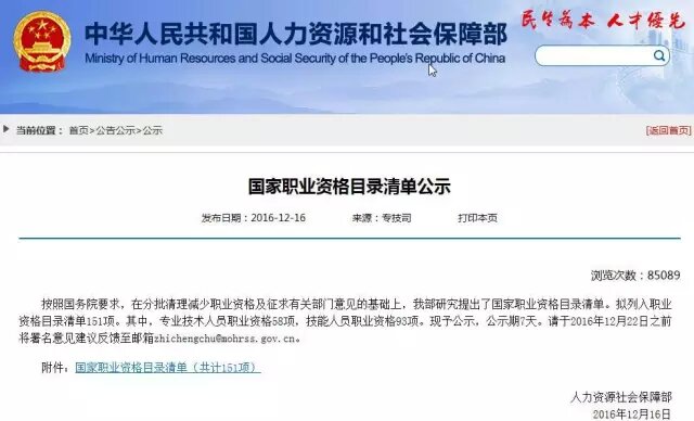 12月16日,人力資源社會保障部公示提出了國家職業(yè)資格目錄清單。擬列入職業(yè)資格目錄清單151項。其中,專業(yè)技術人員職業(yè)資格58項,技能人員職業(yè)資格93項。公示期7天,至2016年12月22日結束。