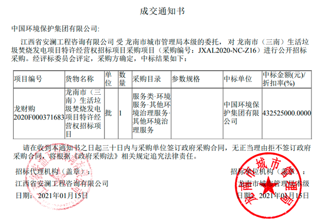 直至2020年1月15日,中國固廢網(wǎng)從E20環(huán)境平臺標訊采集系統(tǒng)E標通獲悉,江西省龍南市(三南)生活垃圾焚燒發(fā)電項目特許經(jīng)營權招標項目公布中標結果,中國環(huán)境保護集團有限公司中標該項目,中標金額:432525000元,項目服務時間30年。