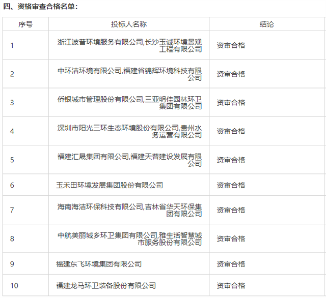 據(jù)了解,該項目招標過程中吸引了多家環(huán)衛(wèi)龍頭企業(yè)競標,在1月4日的資格審查結果公告中,共有10家(含7個聯(lián)合體)通過資格審查,資格審查合格名單如下: