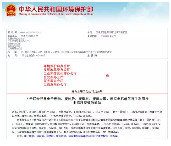 為貫徹落實《土壤污染防治行動計劃》《國務(wù)院辦公廳關(guān)于印發(fā)禁止洋垃圾入境推進固體廢物管理制度改革實施方案》(國辦發(fā)〔2017〕70號),環(huán)境保護部聯(lián)合發(fā)展改革委、工業(yè)和信息化部、公安部、商務(wù)部、工商總局開展電子廢物、廢輪胎、廢塑料、廢舊衣服、廢家電拆解等再生利用行業(yè)清理整頓。