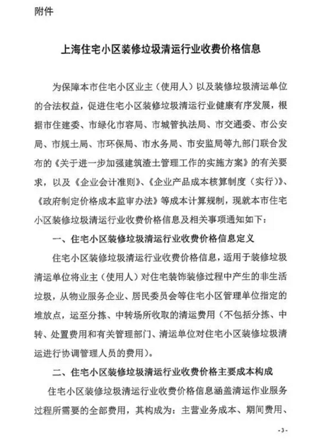 《上海市住宅小區(qū)裝修垃圾清運(yùn)行業(yè)收費(fèi)價(jià)格信息》全文內(nèi)容如下: