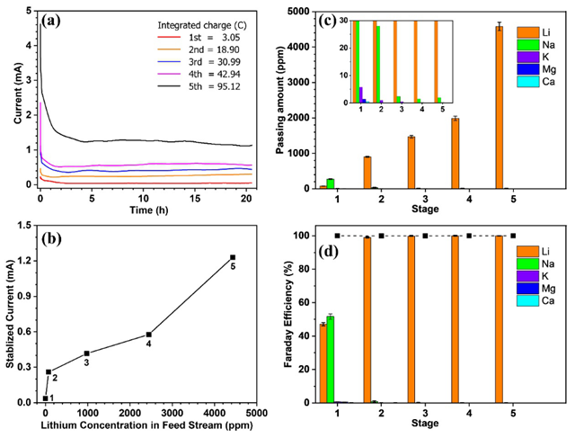 圖2.(a)提鋰過(guò)程中每一級(jí)的計(jì)時(shí)電流曲線(xiàn),曲線(xiàn)與時(shí)間的積分即為該過(guò)程中遷移的總電荷量;(b)提鋰過(guò)程中穩(wěn)定電流與原料鋰濃度的關(guān)系;(c)提鋰過(guò)程中每一級(jí)的離子通過(guò)量;插圖顯示情節(jié)在低范圍內(nèi),以幫助查看干擾離子的結(jié)果:(d)提鋰過(guò)程中每一級(jí)中不同離子的遷移對(duì)電流的貢獻(xiàn)率。實(shí)心方塊表示總體效率(100%)。