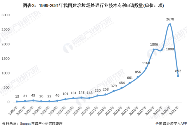 據(jù)前瞻在專利信息服務(wù)平臺Soopat統(tǒng)計, 2020年為2678項,截至2021年4月,我國建筑垃圾處理行業(yè)技術(shù)專利申請數(shù)量共892件。