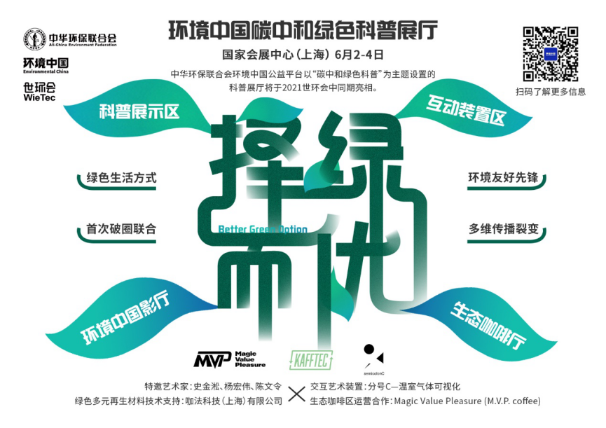中華環(huán)保聯(lián)合會環(huán)境中國公益平臺以“碳中和綠色科普”為主題設(shè)置的科普展廳將于2021世環(huán)會中同期亮相,該展廳由科普展示區(qū)、互動裝置區(qū)、環(huán)境中國影廳、生態(tài)咖啡廳組成。將邀請藝術(shù)名家史金淞、楊宏偉等展出為此次展廳特別呈現(xiàn)的作品,也有青年新媒體藝術(shù)團(tuán)隊(duì)“分號C”首次呈現(xiàn)將二氧化碳排放數(shù)據(jù)可視化的交互藝術(shù)裝置,觀眾們還能從展廳易讀易懂的文字圖表呈現(xiàn)方式中詳盡地感受“碳中和”跟每個人的密切聯(lián)系,觀察“碳中和”帶來的行業(yè)巨變,理解“碳中和”的內(nèi)涵意義和歷史價值;生態(tài)咖啡廳將綠色低碳的消費(fèi)方式體現(xiàn)在咖啡廳的一桌一椅,一杯一盞中;搭建也將全面應(yīng)用綠色多元再生材料,共同倡導(dǎo)大眾進(jìn)行“Better Green Option/擇綠而優(yōu)”的綠色生活方式選擇。通過科普展廳的全面展示,參會觀眾將和“碳中和”重要議題建立聯(lián)系,認(rèn)識到在嚴(yán)峻的氣候問題面前需要肩負(fù)的責(zé)任,自發(fā)地加入行動中。屆時將會邀請多位環(huán)境友好引領(lǐng)者和KOL環(huán)境先鋒達(dá)人參展,與多個不同領(lǐng)域媒體共同進(jìn)行跨界宣傳與破圈。