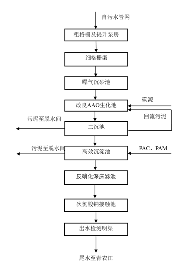 (1)外部市政管網(wǎng)來水+采用粗格柵+提升泵站+細(xì)格柵+曝氣沉砂池+A2/O+二沉池+高效沉淀池+反硝化深床濾池+接觸消毒池工藝。