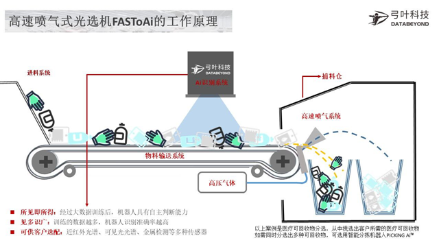 弓葉科技自主研發(fā)的智能垃圾分選裝備已實(shí)現(xiàn)落地應(yīng)用,目前參與了國內(nèi)多個垃圾處理項(xiàng)目,其中包含混合生活垃圾、可回收垃圾、廚余垃圾、餐廚垃圾、建筑垃圾等領(lǐng)域。同時(shí),弓葉科技還將其剛推出的高速噴氣式光選機(jī)FASToAI運(yùn)用到了醫(yī)療廢棄物處理領(lǐng)域中,幫助醫(yī)療機(jī)構(gòu)及醫(yī)廢處置單位降本增效,實(shí)現(xiàn)了對醫(yī)用級塑料垃圾的準(zhǔn)確分選,同時(shí)大大降低了醫(yī)療工作人員垃圾分類的工作量與時(shí)間成本。