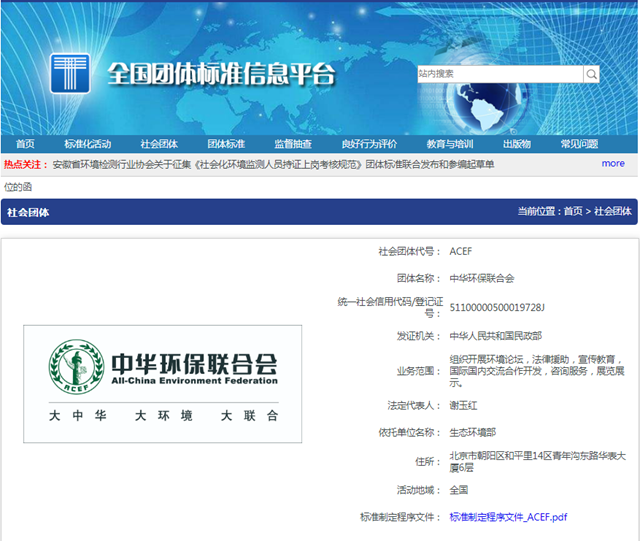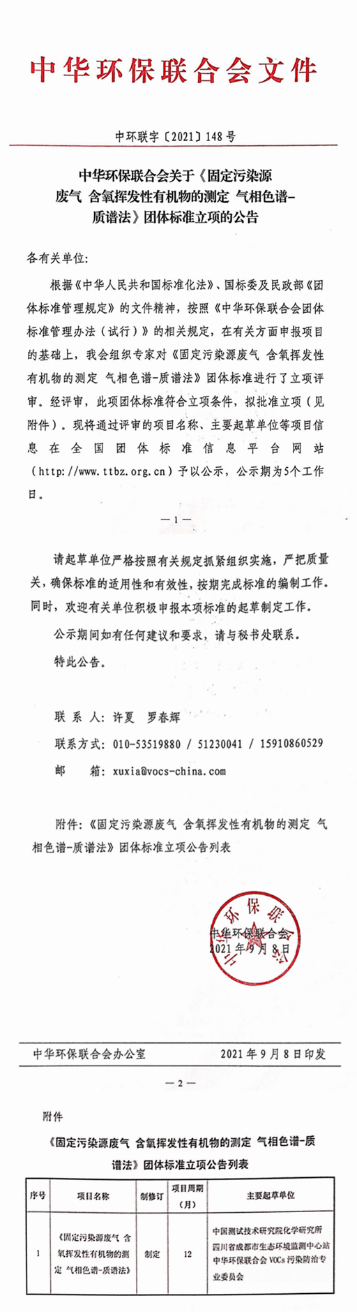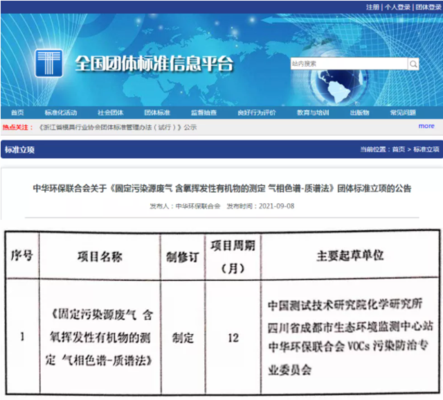 為了貫徹落實《中華人民共和國標準化法》、國務(wù)院《深化標準化工作改革方案》、國家標準化管理委員會和民政部印發(fā)的《團體標準管理規(guī)定》(國標委聯(lián)〔2019〕1號)的文件精神;按照《中華環(huán)保聯(lián)合會團體標準管理辦法(試行)》要求,經(jīng)中華環(huán)保聯(lián)合會立項批準,由中國測試技術(shù)研究院化學(xué)研究所、四川省成都市生態(tài)環(huán)境監(jiān)測中心站和中華環(huán)保聯(lián)合會VOCs污染防治專業(yè)委員會等單位共同發(fā)起的全國團體標準《固定污染源廢氣 含氧揮發(fā)性有機物的測定 氣相色譜-質(zhì)譜法》起草制定工作現(xiàn)已啟動;按照流程,標準項目信息已獲得全國團體標準信息平臺的立項公示。
