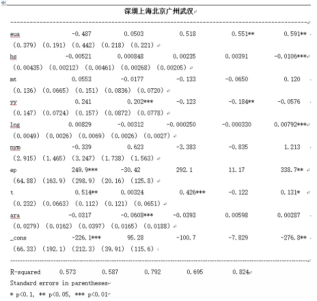 在篩選掉缺失數(shù)據(jù)并統(tǒng)一時(shí)間與貨幣單位后,本文最終對(duì)深圳、上海、北京、廣東、以及湖北在2017年1月至2021年1月這四年間的日度數(shù)據(jù)進(jìn)行回歸。研究發(fā)現(xiàn),五次回歸模型在F檢驗(yàn)中的P值均<0.01,可見(jiàn)此模型均在0.01水平上是有效的。其次,深圳、上海、北京、廣東、以及湖北在以一系列應(yīng)變量的回歸模型中R方分別為0.5730、0.5871、0.7920、0.6952、0.8243,盡管相對(duì)于宏觀層面R方的大小并不是很大,但具有一定的解釋意義。