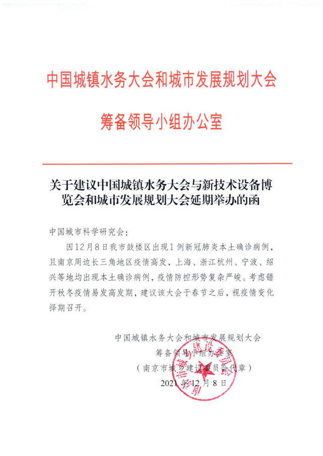 為切實(shí)保障與會(huì)專家學(xué)者、參會(huì)參展代表的健康安全,經(jīng)組委會(huì)慎重研究決定,原延期至2021年12月16日-17日在南京同期舉辦的“2021(第十六屆)中國城鎮(zhèn)水務(wù)發(fā)展國際研討會(huì)與新技術(shù)設(shè)備博覽會(huì)”和“2021(第十六屆)城市發(fā)展與規(guī)劃大會(huì)”很遺憾將延期召開,具體視疫情變化擇期召開。