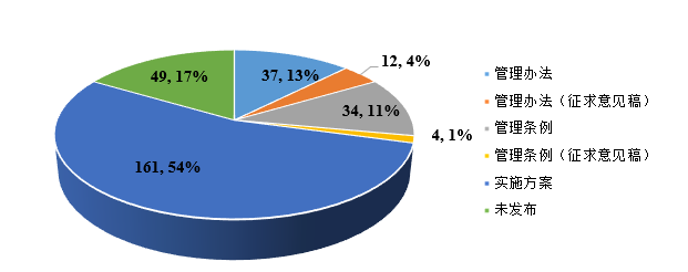 生活垃圾分類正由點(diǎn)到面逐步推開。據(jù)E20研究院觀察,截止到目前為止,297個(gè)地級(jí)以上城市其中有49個(gè)城市出臺(tái)垃圾分類管理辦法(其中12個(gè)城市處于征求意見稿階段),38個(gè)城市出臺(tái)垃圾分類管理?xiàng)l例(其中4個(gè)城市處于征求意見稿階段),161個(gè)城市公布垃圾分類實(shí)施方案,49個(gè)城市目前尚未公布相關(guān)法律法規(guī)制度,制度出臺(tái)城市占比達(dá)84%。