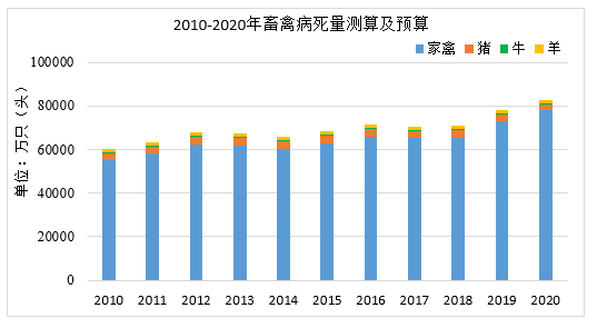 根據(jù)國家統(tǒng)計(jì)局、農(nóng)業(yè)農(nóng)村部公開畜禽出欄量/存欄量數(shù)據(jù)測(cè)算病死量。養(yǎng)殖場的畜禽死亡率一般在5%~10%之間,若按5%計(jì)算,我國畜禽死亡量從2010年6.03億頭(只)增長至2020年的8.25億頭(只),復(fù)合增長率3%,其中家禽類占據(jù)大部分。由于2018年“非洲豬瘟”疫情我國累積撲殺近100萬頭生豬,實(shí)際死亡量可能高于預(yù)測(cè)數(shù)值。死畜禽攜帶大量的病原微生物,不僅污染環(huán)境,對(duì)于人體健康和畜禽養(yǎng)殖業(yè)的健康發(fā)展也存在嚴(yán)重威脅。因此,對(duì)死畜禽進(jìn)行無害化處理是解決環(huán)境污染、實(shí)現(xiàn)畜牧業(yè)良性發(fā)展的必由之路。
