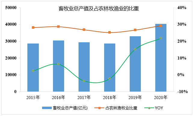 隨著生活水平的提高,人民對(duì)畜禽產(chǎn)品的需求不斷提升,進(jìn)而促進(jìn)了畜牧業(yè)的發(fā)展。根據(jù)國家統(tǒng)計(jì)局?jǐn)?shù)據(jù)顯示,全國畜牧業(yè)總產(chǎn)值從2015年28649億元發(fā)展到2020年的40266億元,經(jīng)過一定時(shí)期的增長,2020年畜牧業(yè)迎來歷史新高。畜牧業(yè)占農(nóng)林牧漁業(yè)總產(chǎn)值比重維持在25%~30%,已經(jīng)成為其支柱產(chǎn)業(yè)。畜牧業(yè)的快速發(fā)展對(duì)農(nóng)民的增收、農(nóng)村經(jīng)濟(jì)的發(fā)展做出了重大貢獻(xiàn)。