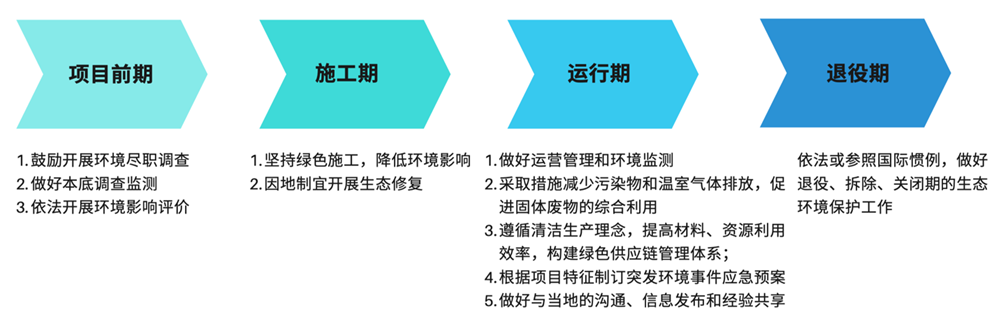 不僅如此,在為各重點行業(yè)制定環(huán)境管理要點的過程中,2022版《指南》也盡可能地體現(xiàn)了對于項目各個階段的細化要求。譬如,對于交通基礎(chǔ)設(shè)施項目,根據(jù)2022版《指南》的規(guī)定,企業(yè)應(yīng)在項目前期做到合理選址,盡量避免對于生物多樣性的破壞;在施工期,建設(shè)相應(yīng)的緩解或補償措施,并加強環(huán)境管理;在施工結(jié)束后,及時開展生態(tài)環(huán)境恢復(fù)。