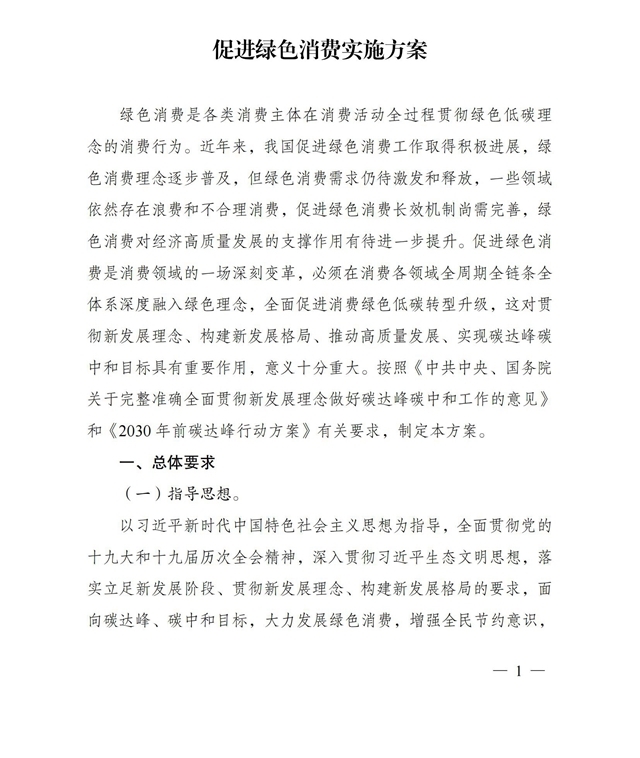 為深入貫徹落實(shí)《中共中央、國務(wù)院關(guān)于完整準(zhǔn)確全面貫徹新發(fā)展理念做好碳達(dá)峰碳中和工作的意見》和《2030年前碳達(dá)峰行動方案》有關(guān)要求,根據(jù)碳達(dá)峰碳中和工作領(lǐng)導(dǎo)小組部署安排,國家發(fā)展改革委、工業(yè)和信息化部、住房和城鄉(xiāng)建設(shè)部、商務(wù)部、市場監(jiān)管總局、國管局、中直管理局會同有關(guān)部門研究制定了《促進(jìn)綠色消費(fèi)實(shí)施方案》?,F(xiàn)印發(fā)給你們,請結(jié)合實(shí)際,認(rèn)真抓好貫徹落實(shí)。