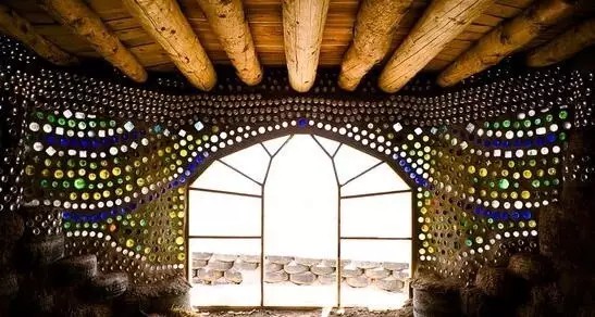 這是美國建筑師麥克·萊諾茲的作品。他的作品外形千奇百怪,而且都遵循著同一種理念:不需任何外接水電排污系統(tǒng),能夠自己發(fā)電,調(diào)溫,生產(chǎn)食物,收集循環(huán)用水;基本建材全是垃圾,廢棄輪胎、易拉罐、飲料瓶等。他給它們起了個名字:地球之舟Earthship。圖中的房子用輪胎和瓶子筑成的墻非常厚實,足以抵抗九級地震。