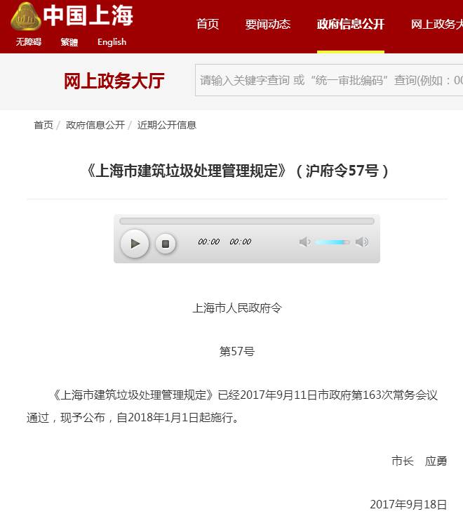 《上海市建筑垃圾處理管理規(guī)定》已經(jīng)2017年9月11日市政府第163次常務(wù)會議通過,現(xiàn)予公布,自2018年1月1日起施行。