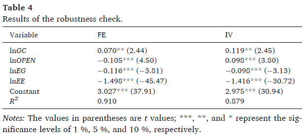 為了緩解模型中存在的由變量缺失或綠色信貸測(cè)量誤差引起的內(nèi)生問(wèn)題,本研究采用綠色信貸的一階滯后項(xiàng)作為工具變量。表3中報(bào)告的工具變量法(IV)產(chǎn)生的估計(jì)結(jié)果與固定效應(yīng)模型基本一致??刂谱兞康南禂?shù)和顯著性水平也與之前的結(jié)果一致。