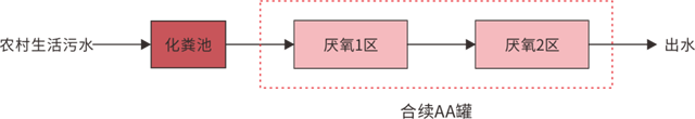 生活污水經(jīng)農(nóng)戶管網(wǎng)收集后首先進(jìn)入化糞池單元,后流至AA罐分戶污水處理設(shè)備內(nèi),從厭氧1區(qū)到厭氧2區(qū)。