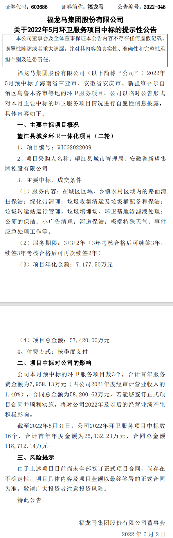 2022年6月2日,福龍馬集團股份有限公司(下稱“福龍馬”)發(fā)布“關于2022年5月環(huán)衛(wèi)服務項目中標的提示性公告”。