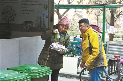 昨天上午,北青報記者來到朝陽區(qū)勁松農光里中社區(qū)。春節(jié)假期剛過,這里已在全市率先試點垃圾分類回收與再生資源回收“兩網融合”,探索垃圾分類、分質、分時收運模式,引導居民在源頭做好垃圾分類。