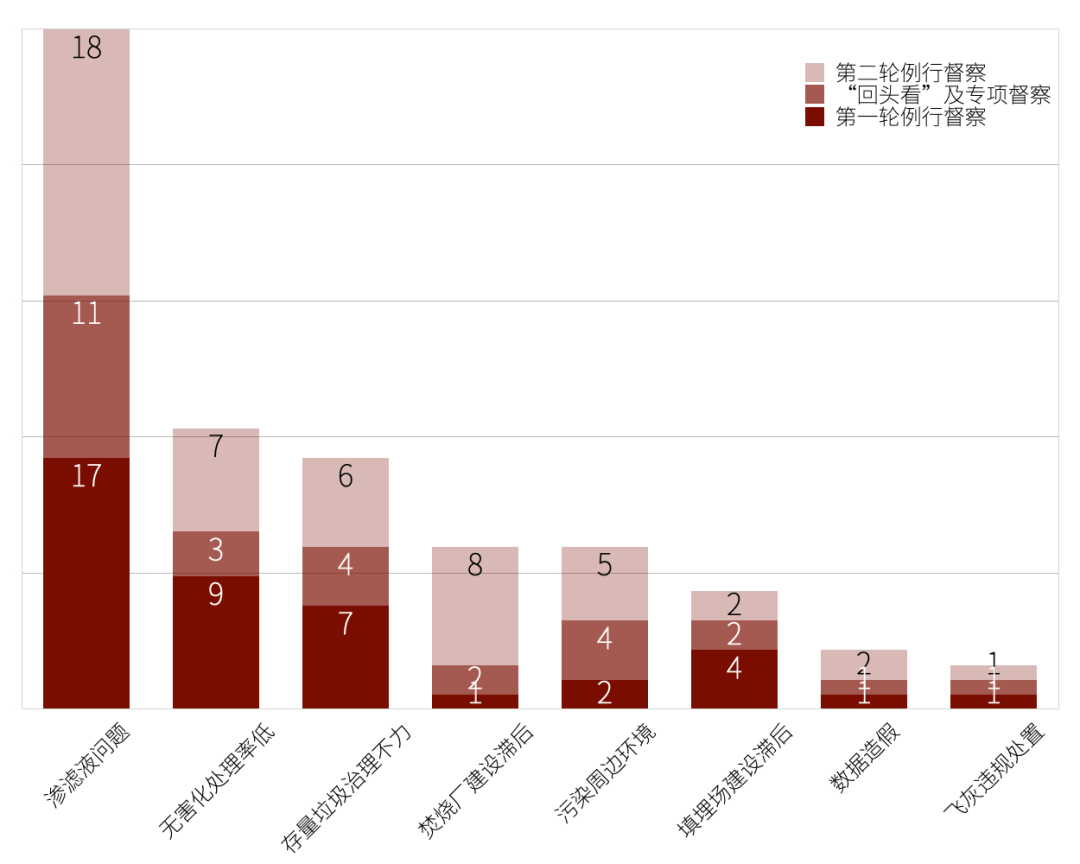 中央環(huán)保督察作為中國生態(tài)文明建設(shè)的一項重大制度創(chuàng)新,是落實環(huán)境保護“黨政同責”“一崗雙責”主體責任的重要舉措,具有代表中央權(quán)威、剛性約束、公眾參與、持續(xù)追蹤等特征。2015年開始至2022年6月,中央環(huán)保督察組共完成了2輪針對31個省區(qū)市的例行督察和1輪針對20個省區(qū)市的“回頭看”及專項督察,其中“生活垃圾”作為與公眾生活息息相關(guān)的議題,在中央環(huán)保督察工作組向各省區(qū)市反饋督察情況時頻繁出現(xiàn),個別嚴重問題因整改不力被公眾反復(fù)舉報。統(tǒng)計發(fā)現(xiàn),82份反饋意見中有60份涉及生活垃圾問題,分類統(tǒng)計歸納為兩大類22個小項共包含161次生活垃圾問題(部分省份的單份反饋意見中同時包括多個不同的生活垃圾問題),其中滲濾液違規(guī)處理問題最為突出、飛灰違規(guī)處置等問題反復(fù)出現(xiàn)、焚燒廠建設(shè)滯后等階段性出現(xiàn)。中央環(huán)保督察源自2015年7月中央全面深化改革領(lǐng)導(dǎo)小組第十四次會議,會議審議通過《環(huán)境保護督察方案(試行)》,也標志著中央生態(tài)環(huán)境保護督察制度(原中央環(huán)境保護督察,一般稱中央環(huán)保督察)正式建立。