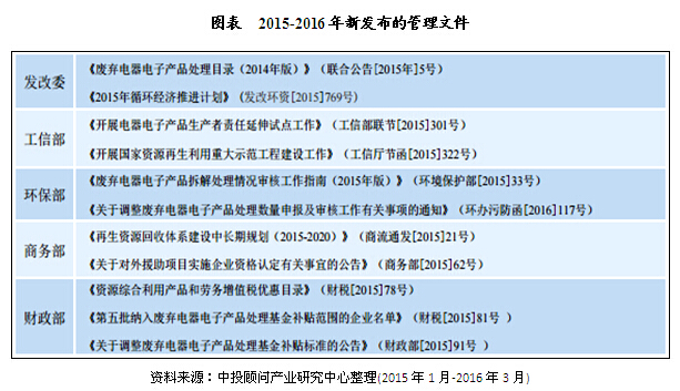 中投顧問發(fā)布的《2017-2021年中國電子廢棄物處理行業(yè)深度調(diào)研及投資前景預測報告》指出,我國廢棄電器電子產(chǎn)品回收處理的管理包括再生資源和環(huán)境保護兩個領域,涉及電器電子產(chǎn)品的綠色設計與制造、再制造、回收、處理和資源綜合利用和處置多個環(huán)節(jié)。從人大立法、國務院《廢棄電器電子產(chǎn)品回收處理管理條例》、到主管部委的管理辦法和規(guī)章、標準,已經(jīng)形成一個至上而下的較為完善的管理體系。