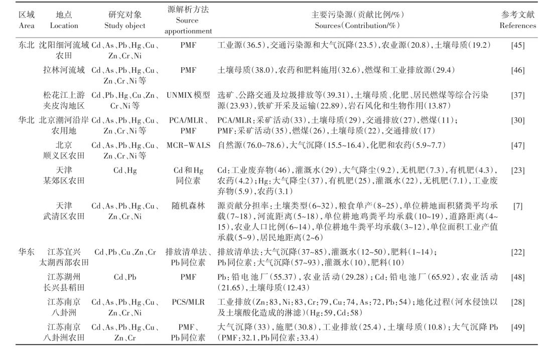 華東地區(qū)的土壤重金屬源解析工作研究程度比較高,收集到的相關(guān)文獻(xiàn)有40篇,區(qū)域主要集中在浙江、江蘇和山東,涉及6071個(gè)表層土壤樣品,所采用的定性源解析方法主要為PCA、相關(guān)分析、CA、空間分析等,定量源解析方法有PMF、同位素比值法及混合方法等(表3)。該地區(qū)土壤中的主要污染元素仍為Cd,其次為Cu、Hg等。山東壽光地區(qū)的大棚土中,Cd、Cu、Zn、Hg受控于施用肥料和農(nóng)藥等農(nóng)業(yè)活動(dòng),As、Pb、Cr、Ni則主要來(lái)源于土壤母質(zhì),后三者還有工業(yè)活動(dòng)的貢獻(xiàn)。而南京地區(qū)農(nóng)田土壤中的Cd則主要來(lái)源于土壤母質(zhì)和肥料等農(nóng)業(yè)投入品這兩者的貢獻(xiàn);Cu和Zn的來(lái)源一致,以農(nóng)業(yè)投入品(如肥料)為主,其次還有大氣沉降(交通、工業(yè)活動(dòng))的貢獻(xiàn);Hg的來(lái)源復(fù)雜,受土壤母質(zhì)、工業(yè)排放(如燃煤)、交通、農(nóng)業(yè)(如高Hg農(nóng)藥)等多因素影響;As則主要受控于土壤母質(zhì)及交通和工業(yè)活動(dòng)引起的大氣沉降;Pb來(lái)源于大氣沉降(交通、工業(yè)活動(dòng))的貢獻(xiàn);Cr和Ni除了受工業(yè)活動(dòng)的影響,部分地區(qū)使用的肥料對(duì)Cr也有貢獻(xiàn)。總體來(lái)看,工業(yè)活動(dòng)的貢獻(xiàn)在南京地區(qū)相對(duì)較高,與定量解析結(jié)果基本一致(表2)。對(duì)于浙江地區(qū),其土壤中各重金屬元素的污染來(lái)源基本與南京地區(qū)一致,但Cd和Cu以及Pb和As還分別增加了工業(yè)(如鉛電池廠、電子廢料等)以及農(nóng)業(yè)活動(dòng)(如肥料施用)的貢獻(xiàn)??傮w來(lái)看,土壤母質(zhì),人為污染源中大氣沉降(工業(yè)和交通)、農(nóng)業(yè)活動(dòng)以及工業(yè)活動(dòng)是南京和浙江地區(qū)農(nóng)田土壤中Cd、As、Pb、Hg、Cu、Zn的主要污染來(lái)源,與安徽、上海、福建地區(qū)的污染源類(lèi)型基本一致。對(duì)于華東地區(qū)非農(nóng)業(yè)土地利用類(lèi)型的土壤來(lái)說(shuō),尤其是工業(yè)區(qū)附近,除部分元素(如 As、Cu、Cr、Ni)主要受控于土壤母質(zhì)外,主要是工業(yè)活動(dòng)造成了土壤中其他重金屬元素的累積。