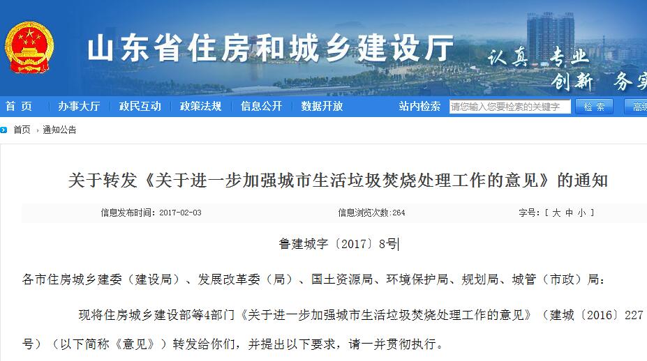 北極星節(jié)能環(huán)保網(wǎng)訊:北極星節(jié)能環(huán)保網(wǎng)獲悉,近日山東省住房和城鄉(xiāng)建設(shè)廳、山東省住房和城鄉(xiāng)建設(shè)廳、山東省發(fā)展和改革委員會(huì)以及山東省國土資源廳山東省環(huán)境保護(hù)廳聯(lián)合發(fā)布關(guān)于轉(zhuǎn)發(fā)《關(guān)于進(jìn)一步加強(qiáng)城市生活垃圾焚燒處理工作的意見》的通知,通知提到,原則上,全省新上城市生活垃圾處理項(xiàng)目,要一律選擇焚燒(發(fā)電)處理技術(shù),現(xiàn)有生活垃圾處理設(shè)施預(yù)期使用年限小于5年的市、縣,要立即啟動(dòng)生活垃圾焚燒處理設(shè)施項(xiàng)目選址、環(huán)評、立項(xiàng)、土地征用、規(guī)劃等前期工作,條件成熟的盡快開工建設(shè)。