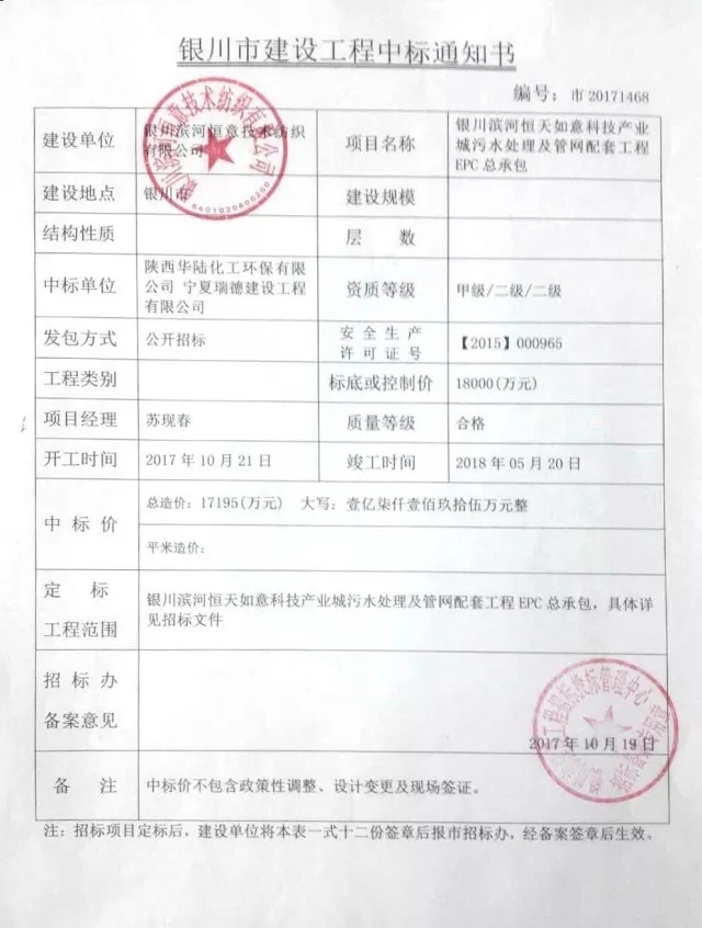 2017年10月19月,華陸環(huán)保憑借著豐富的行業(yè)經(jīng)驗、良好的市場信譽、優(yōu)秀的設(shè)計團隊、完善的服務(wù)體系以及專業(yè)的投標方案,成功中標銀川濱河恒天如意科技產(chǎn)業(yè)城污水處理及管網(wǎng)配套工程EPC總承包項目(以下簡稱:中標項目),中標金額為1.7195億元。
