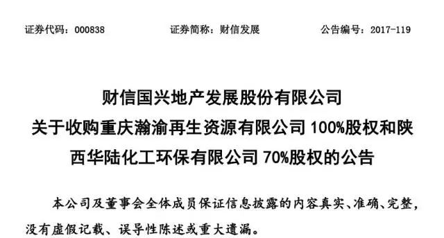 2017年9月29日,財信國興地產(chǎn)發(fā)展股份有限公司(以下簡稱“財信發(fā)展”,股票代碼:000838)收購陜西華陸化工環(huán)保有限公司70%股權(quán)(詳見《財信國興地產(chǎn)發(fā)展股份有限公司關(guān)于收購重慶瀚渝再生資源有限公司100%股權(quán)和陜西華陸化工環(huán)保有限公司70%股權(quán)的公告》),華陸環(huán)保成為財信發(fā)展的控股子公司。