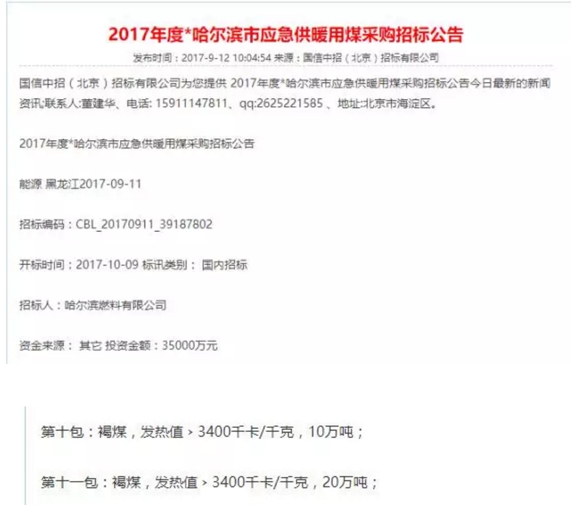 而記者在中國化工產(chǎn)品網(wǎng)上看到,哈爾濱燃料有限公司于今年9月12日發(fā)布了哈市應(yīng)急供暖用煤采購招標(biāo)公告,其中共計30萬噸褐煤僅要求發(fā)熱值大于3400千卡/千克。在企業(yè)注冊信息上,該公司經(jīng)營范圍包括煤炭批發(fā)經(jīng)營。