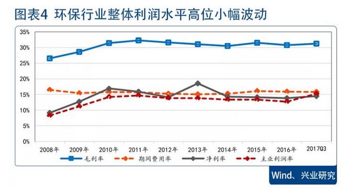 行業(yè)利潤水平高位穩(wěn)定。2017年前三季度環(huán)保行業(yè)整體毛利率為31.27%,同比小幅下降0.41個百分點(diǎn);凈利率為14.51%,同比下降0.1個百分點(diǎn)。雖然非環(huán)保企業(yè)逐步開展環(huán)保類業(yè)務(wù)后,行業(yè)競爭情況有所加劇,但由于行業(yè)空間足夠大、子行業(yè)較多以及特許經(jīng)營制度,企業(yè)間競爭呈現(xiàn)一定差異化特征,因此行業(yè)毛利率和凈利率均能保持高位穩(wěn)定狀態(tài)。