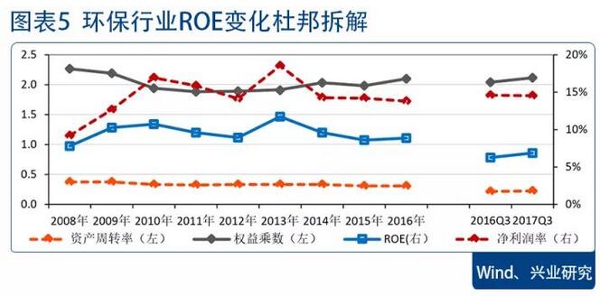 權(quán)益乘數(shù)抬升下,行業(yè)整體盈利能力小幅上升。2017年前三季度環(huán)保行業(yè)整體ROE為6.86%,同比增加0.61個百分點(diǎn)。通過杜邦分析來看,行業(yè)凈利率和資產(chǎn)周轉(zhuǎn)率整體保持穩(wěn)定,盈利能力的提升主要來自權(quán)益乘數(shù)的上升,隨著行業(yè)訂單的逐步釋放和PPP類訂單的增加,環(huán)保企業(yè)融資需求有所提升。