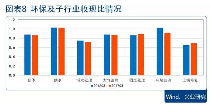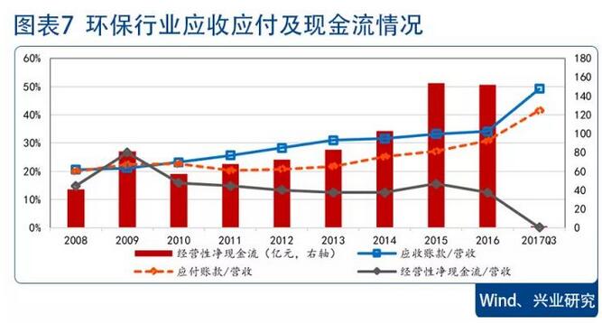 行業(yè)經(jīng)營性現(xiàn)金流仍然較弱。環(huán)保行業(yè)2017年三季度經(jīng)營性現(xiàn)金凈流量為1.45億元,同比下降95.46%,同時,行業(yè)應(yīng)收賬款持續(xù)增長,2017年前三季度為499億元,占營業(yè)收入比例升至49.2%的歷史高點(diǎn)。行業(yè)前三季度經(jīng)營性現(xiàn)金流偏弱主要有四個原因:一、行業(yè)現(xiàn)金流呈現(xiàn)季節(jié)性特征,四季度回款一般會變好;二、設(shè)備制造類企業(yè)由于原材料大幅漲價導(dǎo)致購買商品支付的現(xiàn)金大幅增加(科林環(huán)境、龍凈環(huán)保、菲達(dá)環(huán)保);三、部分污水處理企業(yè)承接的PPP項(xiàng)目增多,導(dǎo)致支付工程款、保證金及為業(yè)主墊款情況增加(碧水源、興源環(huán)境);四、個別企業(yè)票據(jù)業(yè)務(wù)結(jié)算情況增加,導(dǎo)致現(xiàn)金收入減少(盈峰環(huán)境)。