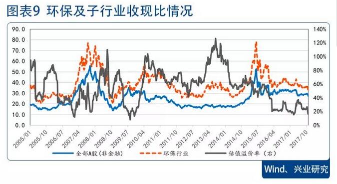 從行業(yè)估值及對全部A股(非金融)的溢價率上看,目前環(huán)保行業(yè)整體估值水平處于歷史偏低位置,估值溢價率也是近幾年低點(diǎn),截至2017年11月3日,環(huán)保行業(yè)整體PE(歷史TTM整體法,剔除負(fù)值)是31.72,估值溢價率為16.15%。