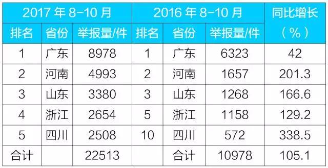 2017年8-10月微信舉報(bào)前五的省份舉報(bào)量及同比情況