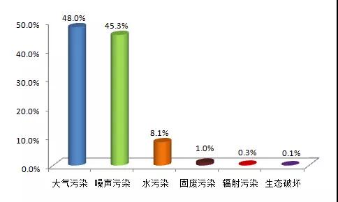 2017年8-10月全國各類舉報(bào)中,涉及大氣污染的舉報(bào)最多,占48%,其次為涉及噪聲、水、固廢的污染舉報(bào),分別占45.3%、8.1%、1%,舉報(bào)量相對(duì)較少的為輻射污染和生態(tài)破壞,分別占0.3%和0.1%。