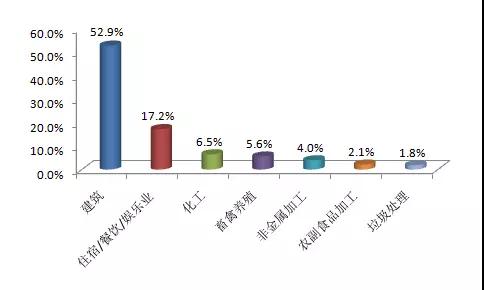 從全國舉報(bào)情況來看,公眾反映最集中的行業(yè)是建筑業(yè),占52.9%,其次是住宿/餐飲/娛樂業(yè)和化工業(yè),分別占17.2%和6.5%。8-10月舉報(bào)次數(shù)較多的企業(yè)有江西省南昌市麥園垃圾填埋場、寧夏回族自治區(qū)銀川市啟元藥業(yè)、廣東省廣州市云埔工業(yè)區(qū)、深圳市紅花嶺垃圾填埋場、下坪垃圾填埋場等。