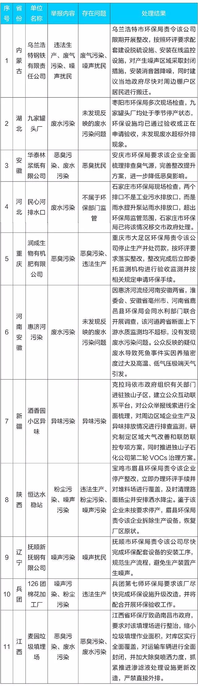 環(huán)境保護(hù)部通過全國環(huán)保舉報(bào)聯(lián)網(wǎng)平臺(tái)對(duì)各地舉報(bào)辦理情況進(jìn)行監(jiān)督,對(duì)媒體、公眾集中關(guān)注或處理不到位的舉報(bào)高度重視,督促地方查清事實(shí),依法實(shí)施處理處罰。8-10月共11件督辦情況如下: