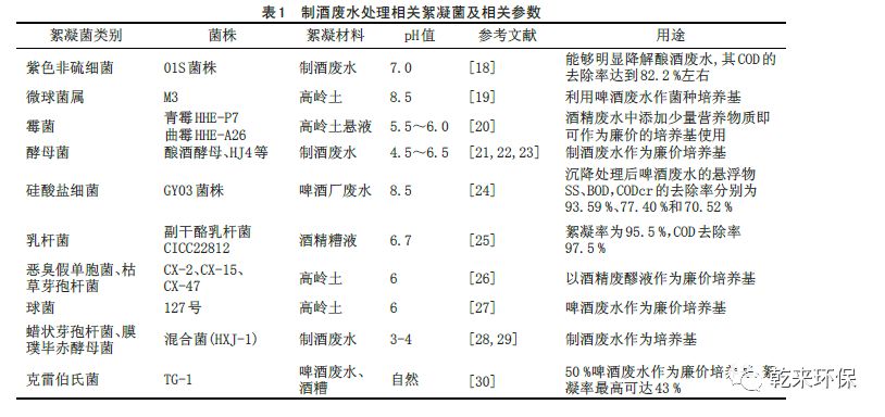 有關(guān)絮凝菌的報(bào)道起源很早,但有關(guān)制酒廢水的絮凝菌報(bào)道起步較晚。近年來(lái)有很多學(xué)者報(bào)道了在制酒廢水處理領(lǐng)域應(yīng)用較好的絮凝菌,主要有細(xì)菌、酵母、霉菌等,具體匯總見(jiàn)表1。