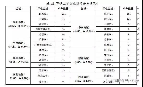 從環(huán)保上市企業(yè)的地理分布看,大部分環(huán)保上市企業(yè)集中在北京市及華東、華南地區(qū),特別是東南沿海省份(如廣東省、浙江省、江蘇省等),而東北、西北地區(qū)部分省市的環(huán)保上市企業(yè)分布較少。這與中國各省的經(jīng)濟發(fā)展?fàn)顩r、城鎮(zhèn)化水平、人口密度等的分布情況較為一致。北京市以及東南沿海省份憑借其地緣優(yōu)勢、較為充沛的資本量、人才薈萃等有利因素,形成了可觀的行業(yè)市場,集聚了大部分環(huán)保上市企業(yè);東北地區(qū)作為經(jīng)濟嚴(yán)重下滑的老工業(yè)區(qū),西北地區(qū)經(jīng)濟欠發(fā)達(dá)、人口密度稀薄,大型環(huán)保上市企業(yè)分布稀少,但隨著“一帶一路”建設(shè)的深入推進(jìn),未來西北地區(qū)環(huán)保產(chǎn)業(yè)或?qū)⒌玫介L足發(fā)展(見表1.1)。