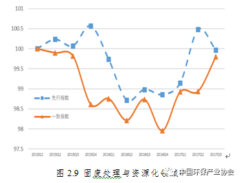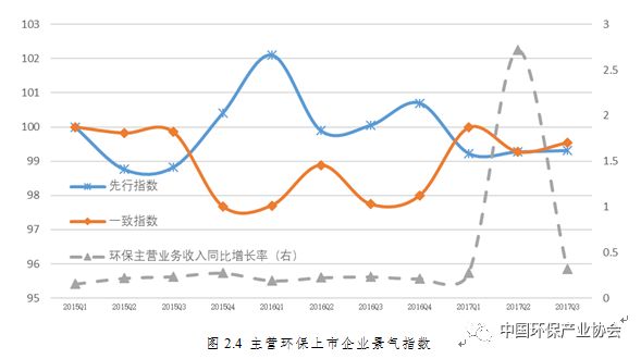 一致指數(shù)顯示,相較景氣波動下滑的2016年,2017年A股環(huán)保上市企業(yè)景氣表現(xiàn)呈現(xiàn)持續(xù)上升態(tài)勢,3季度一致指數(shù)數(shù)值為99.05,高于2016年同期的98.29。主營環(huán)保上市企業(yè)2017年總體景氣表現(xiàn)優(yōu)于2016年,且呈現(xiàn)上升態(tài)勢,3季度數(shù)值一致指數(shù)數(shù)值達(dá)99.53,較上年同期上升了1.79,且略高于同期A股環(huán)保上市企業(yè)(見圖2.3、圖2.4)。
